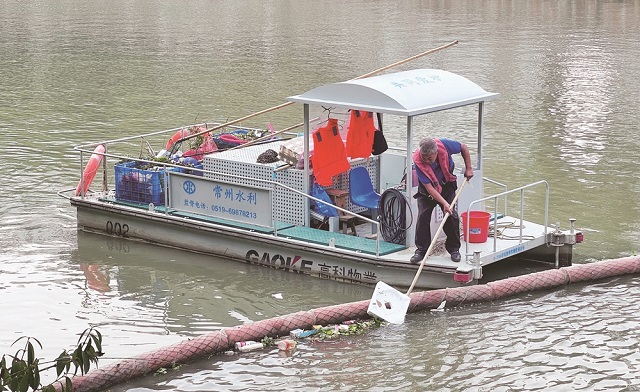在老大運河中吳大橋段,兩座長達20多米的漂浮物攔截設(shè)施橫貫水面,如同一張過濾網(wǎng),攔截上游漂浮來的垃圾,等待河道保潔員清理。“一天最起碼能收集到五六船垃圾,有七八百斤。有了這個攔截設(shè)施,河面上的垃圾基本不會往下游去了。”市河道湖泊管理處河道保潔隊隊長蔣建國介紹。