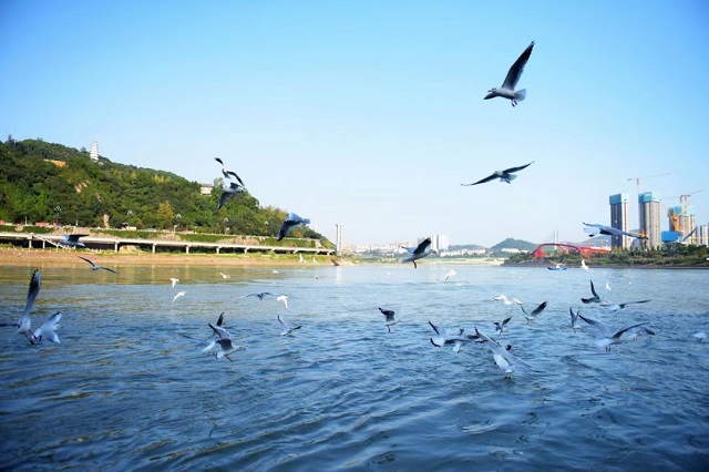 紅嘴鷗在四川省宜賓市三江口上飛舞