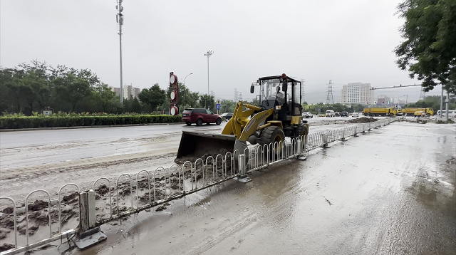 現場,北京環衛集團的相關人員正抓緊對這些淤積泥沙進行清理。在公路上,大型鏟車、多功能作業利用車前的刮板,把淤泥鏟起并堆積起來,再用大型清運車輛拉走后進行沖洗作業。而在人行道上,工作人員主要通過人工作業,利用鐵鍬等工具將路面清理干凈。