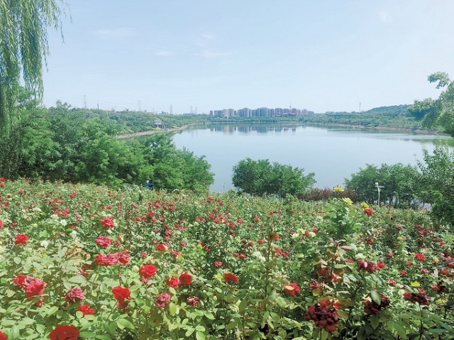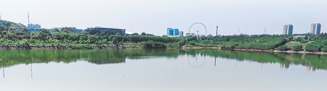西郊雨洪調(diào)蓄工程阜石路砂石坑水面開(kāi)闊,四周植被繁茂。