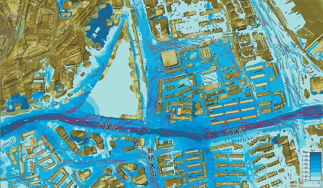 以受災(zāi)較嚴(yán)重的門(mén)頭溝和中門(mén)寺溝兩個(gè)流域?yàn)槔?月1日雨勢(shì)減小后,工作組即刻到山洪沖擊地區(qū)進(jìn)行現(xiàn)場(chǎng)調(diào)研,收集實(shí)地洪水排泄及淹沒(méi)資料;8月4日開(kāi)始搭建洪水反演模擬模型,經(jīng)過(guò)近20次的驗(yàn)證調(diào)試,模擬結(jié)果基本符合實(shí)際。經(jīng)過(guò)驗(yàn)證的模型,可以模擬不同降雨條件下洪水和城市內(nèi)澇的淹沒(méi)情況,為災(zāi)后恢復(fù)重建、長(zhǎng)遠(yuǎn)高質(zhì)量發(fā)展提供決策支持。
