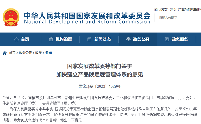 國家發展改革委、工業和信息化部、市場監管總局、住房城鄉建設部、交通運輸部近日聯合印發《關于加快建立產品碳足跡管理體系的意見》,提出到2025年,國家層面出臺50個左右重點產品碳足跡核算規則和標準,國家產品碳標識認證制度基本建立,碳足跡核算和標識在生產、消費、貿易、金融領域的應用場景顯著拓展。到2030年,國家層面出臺200個左右重點產品碳足跡核算規則和標準,碳標識得到企業和消費者的普遍認同,主要產品碳足跡核算規則、標準和碳標識得到國際廣泛認可。