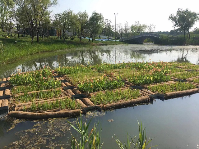 公園中部,寬闊的紫薇大道南北貫穿,連接南北入口。在大道最北端一座橋梁的北側,建設了2個雨水花園,收集周圍的雨水,里面栽種了細葉美女櫻、彩虹石竹、花葉玉簪、紫葉山桃草、花葉美人蕉、細葉芒、矮生蘆竹等多種植物。橋西的河面上,還設置了以太陽能作動力的生態浮床,用于改善河道水質。河道沿線還建設了可溢流生態屏障,雨水進入可溢流生態屏障,利用植物根系、漂浮濕地、人工水草作為掛膜基質,通過生物接觸氧化技術對微污染雨水進行凈化,從而控制外源污染對自然水體水質的影響。栽植的植物品種主要有常綠鳶尾、千屈菜、再力花、苦草等。