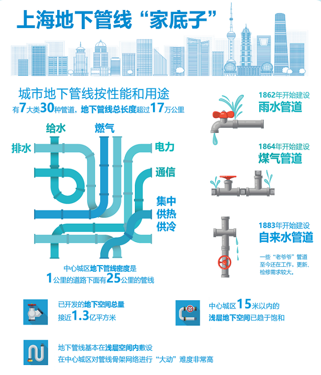 市政管線是城市的生命線。目前上海地下管網(wǎng)按性能和用途已有給水、排水、燃氣、電力、通信、集中供熱供冷等7大類30種管道,地下管線總長度超過17萬公里。總體而言,上海的地下管線建設(shè)和管理一直處于全國領(lǐng)先水平。