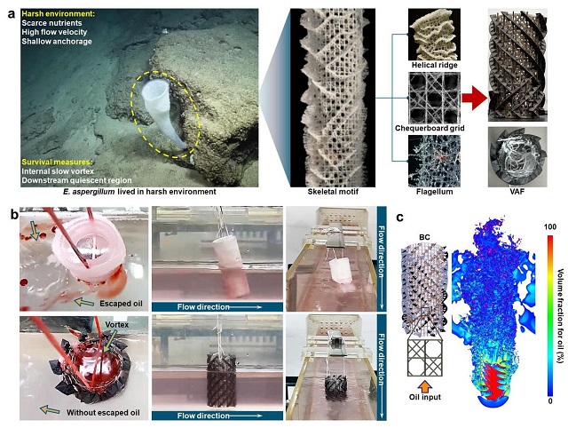 深海玻璃海綿(又稱“維納斯花籃”)是一種在1000m水下固著生長存活上萬年的生物,在適應惡劣環(huán)境的自然選擇過程中演化出獨特的結構,對復雜流態(tài)和貧營養(yǎng)環(huán)境具有良好的適應性。受這一現(xiàn)象啟發(fā),尤世界教授團隊創(chuàng)新提出了一種仿玻璃海綿渦流錨固過濾器(VAF)并利用3D打印技術進行重構,解析了內(nèi)棋盤網(wǎng)格+外脊螺旋復合結構對外部湍流能量削減轉化形成內(nèi)部小尺度渦流的多物理場場協(xié)同機制,賦予了VAF卓越的流體動力學穩(wěn)定性、高效的界面?zhèn)髻|(zhì)特性和更長的內(nèi)部停留時間,實現(xiàn)了亞臨界至超臨界流態(tài)范圍內(nèi)穩(wěn)定捕集浮油、乳化油和溶解油,捕集率高于97%。該研究體現(xiàn)了環(huán)境工程、流體力學、生物物理學和仿生學的深度交叉融合,為解決復雜水動力環(huán)境下的油類污染原位捕集和水環(huán)境修復提供了全新的思路和方法。