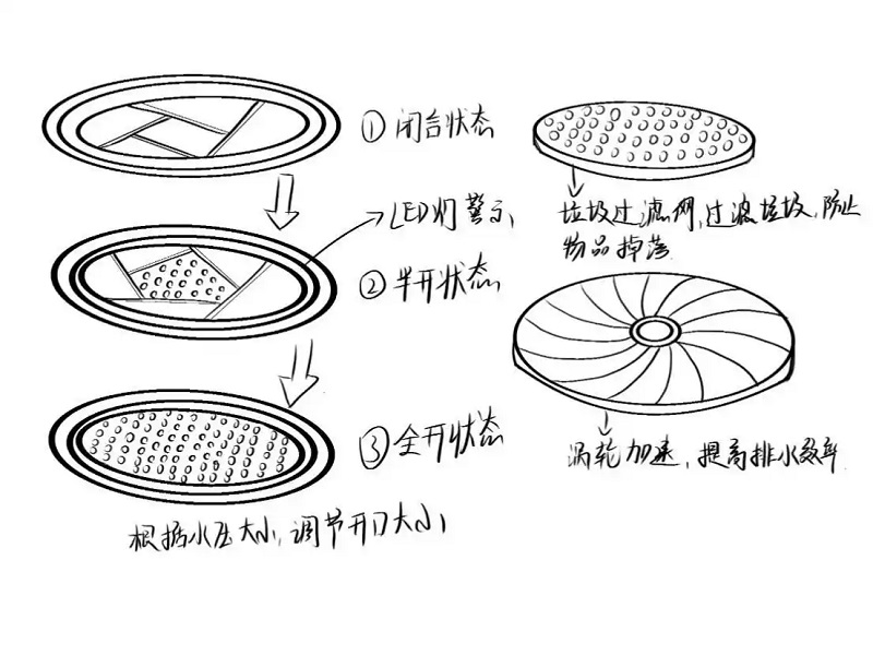 《智雨安行》以前瞻性思維為智慧城市建設中的城市排水難題提供了創新解決方案。該設計從井蓋材質、排水技術及相關電子傳感技術入手,突破性地將機械結構與電子傳感技術融合,提出“可變孔徑”設計理念。該設計使井蓋開口能根據實際水壓自動調節大小,靈活應對不同強度降雨;同時集成LED警示環與安全傳感器,實時監測井蓋狀態,異常時立即預警,構建起真正“會思考”的排水系統。“讓城市即使在極端天氣下仍保持‘呼吸’暢通”,在潘一博的設計構想中,井蓋是能感知環境變化、自主響應的“智能衛士”,同時滿足排水效率與公共安全雙重需求。