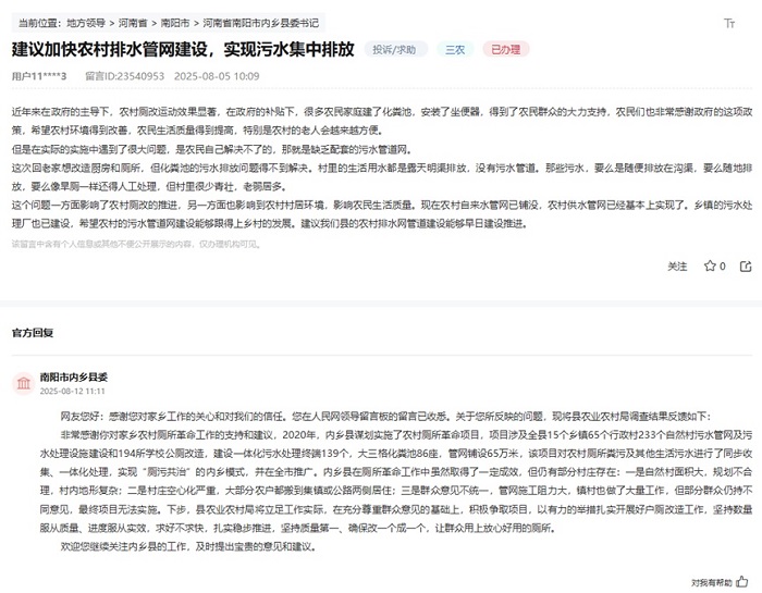 內(nèi)鄉(xiāng)縣農(nóng)業(yè)農(nóng)村局在回復(fù)中坦言,鄉(xiāng)鎮(zhèn)污水處理廠雖已建成,但管網(wǎng)配套仍是短板。“我們正積極爭取項目,以有力的舉措扎實開展好戶廁改造工作,堅持?jǐn)?shù)量服從質(zhì)量、進度服從實效,求好不求快,扎實穩(wěn)步推進,堅持質(zhì)量第一,確保改一個成一個,讓群眾用上放心好用的廁所。”