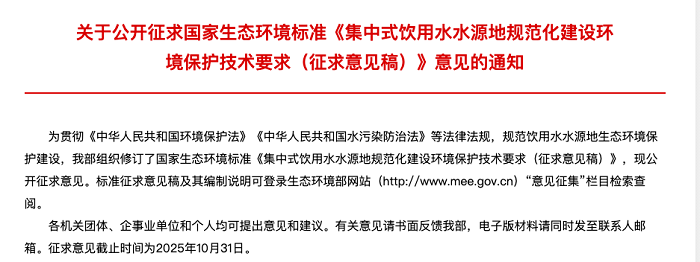 為貫徹《中華人民共和國環(huán)境保護法》《中華人民共和國水污染防治法》,規(guī)范飲用水水源地生態(tài)環(huán)境保護建設,提升水源水質安全保障水平,生態(tài)環(huán)境部日前發(fā)布通知,就《集中式飲用水水源地規(guī)范化建設環(huán)境保護技術要求(征求意見稿)》(以下簡稱《征求意見稿》)公開征求社會各界意見,意見反饋截止日期為2025年10月31日。