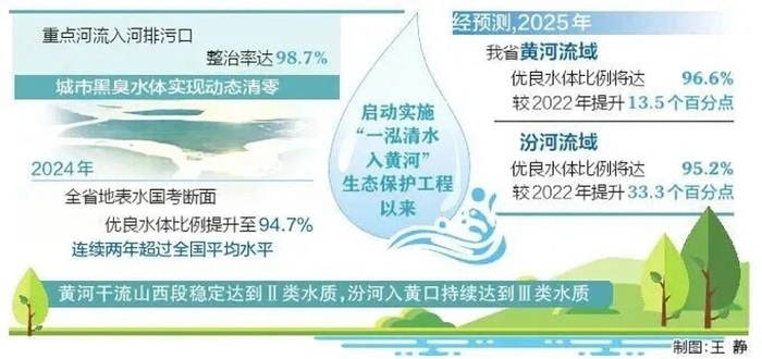 為推動黃河流域水生態(tài)環(huán)境整體改善,我省深入推進(jìn)碧水保衛(wèi)戰(zhàn)。強(qiáng)化水資源、水環(huán)境、水生態(tài)“三水”統(tǒng)籌,啟動實施“一泓清水入黃河”生態(tài)保護(hù)工程,重點(diǎn)河流入河排污口整治率達(dá)98.7%,城市黑臭水體實現(xiàn)動態(tài)清零。2024年,全省地表水國考斷面優(yōu)良水體比例提升至94.7%,連續(xù)兩年超過全國平均水平,黃河干流山西段穩(wěn)定達(dá)到Ⅱ類水質(zhì),汾河入黃口持續(xù)達(dá)到Ⅲ類水質(zhì)。