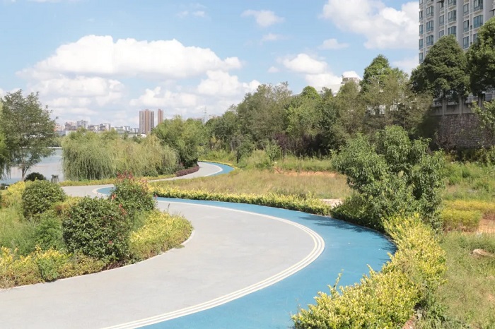 位于安順經(jīng)開區(qū)的花山綠道,總長(zhǎng)約2.4公里,保留原162鐵路原始風(fēng)貌,沿線設(shè)置三線文化廣場(chǎng)、休息椅等設(shè)施,同時(shí)鋪設(shè)透水路面、建設(shè)植草溝,既串聯(lián)起休閑健身與文化體驗(yàn)功能,又能有效滯留雨水。老城環(huán)路虹山湖路段則打造了下沉式綠地、觀景平臺(tái),夜晚燈光亮起時(shí),成為市民休憩打卡的熱門地點(diǎn)。市政道路與背街小巷的海綿化改造也同步推進(jìn),通過(guò)鋪設(shè)透水路面、打造下凹式綠化帶等方式,讓雨水“落地即滲”。